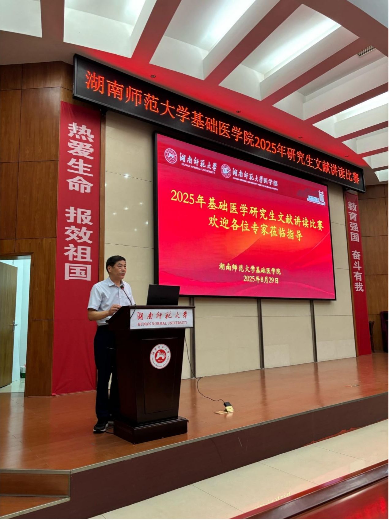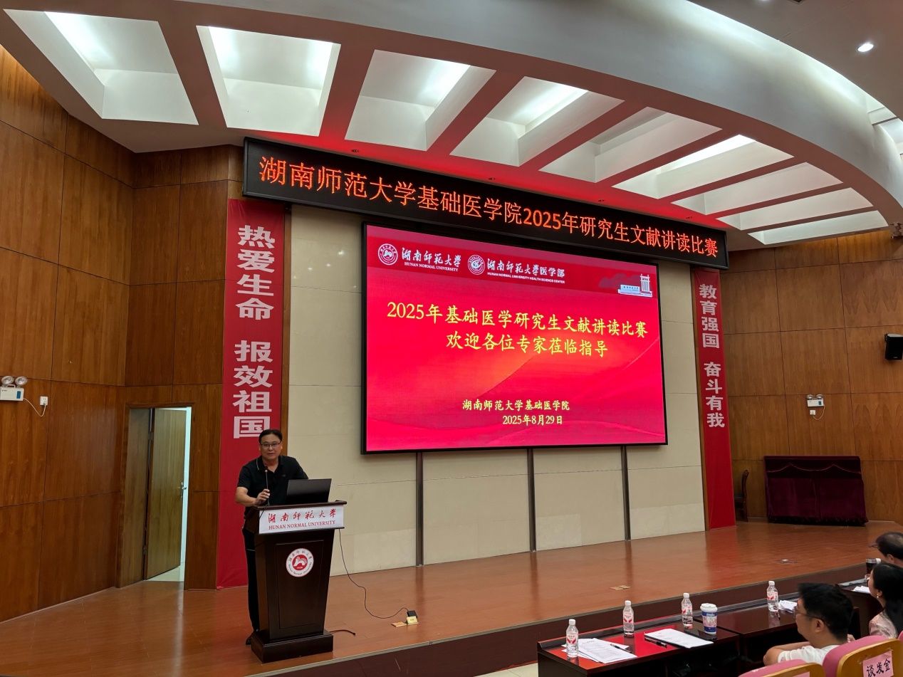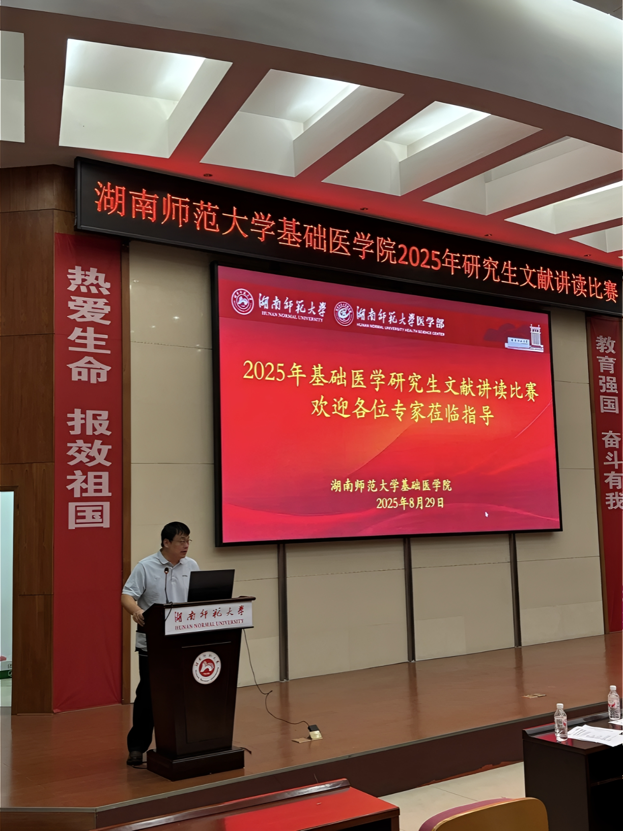 8月29日,正值夏末秋初、暑气未消之际,湖南师范大学基础医学院2025年(第二届)基础医学研究生文献讲读比赛在学术报告厅顺利举行。医学部党工委副书记鄢朝晖、医学科技处副处长余星、医院管理处副处长、护理学院副院长何平平出席比赛。基础医学院邓锡云教授主持比赛。