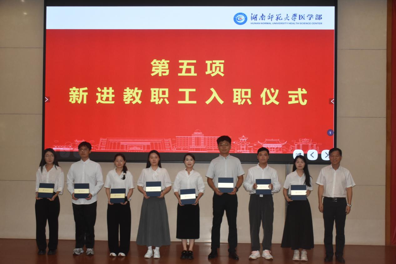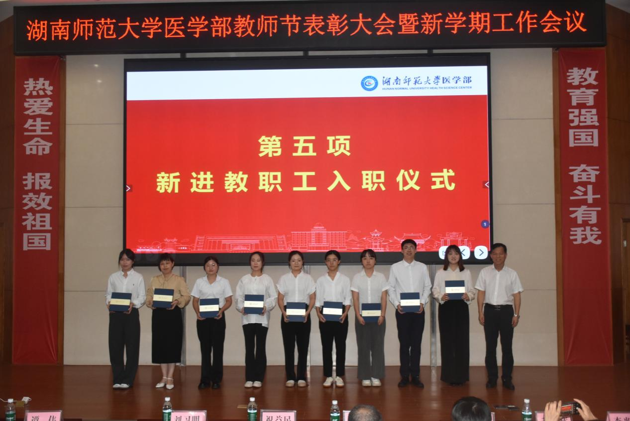 大会举行了庄严的新进教职工入职仪式。本年度医学部成功引进专任教师10名、教辅及管理人员8名,创历史新高。新教师们逐一上台自我介绍并庄严宣誓,表达了投身医学教育事业、恪尽职责的坚定决心。祝益民书记为新教师们赠送校徽,标志着他们正式成为医学部大家庭的一员。