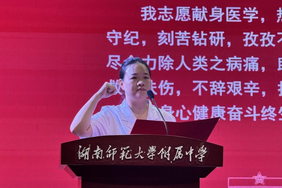 本科新生代表贺佳静表达了对大学生活的期待,倡议同学们珍惜时光、夯实基础、携手同行,共同开启精彩的医学旅程。