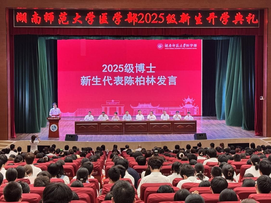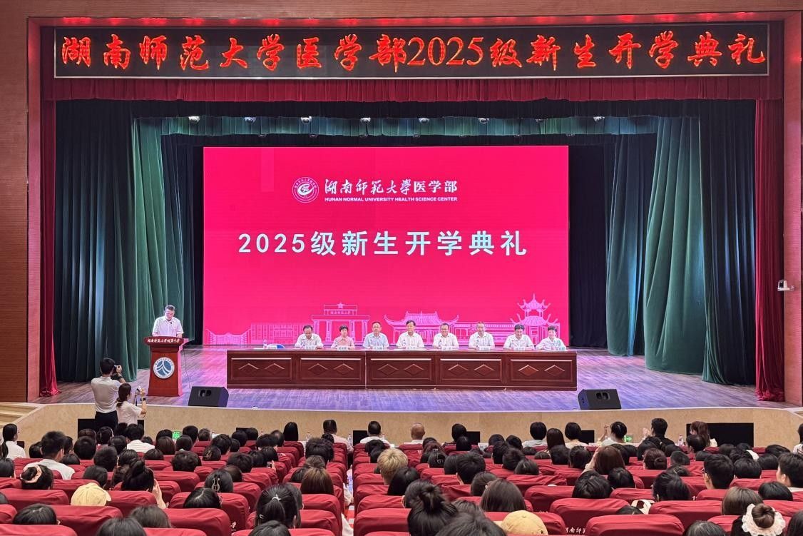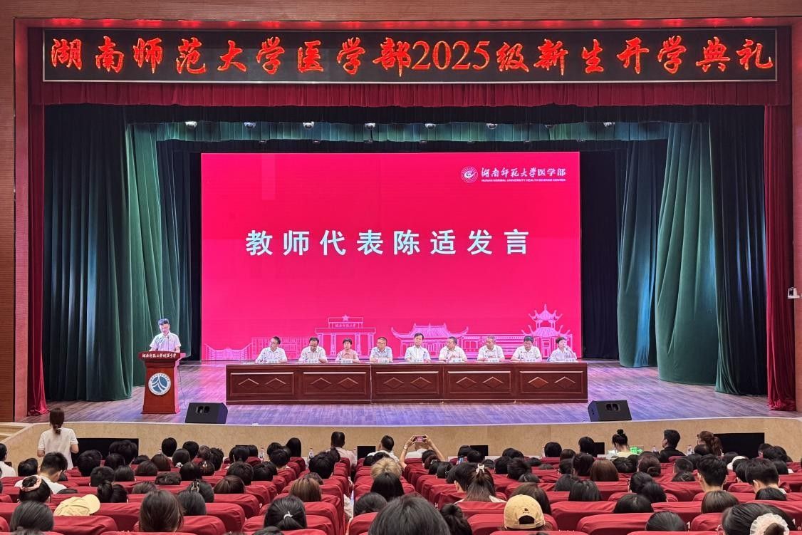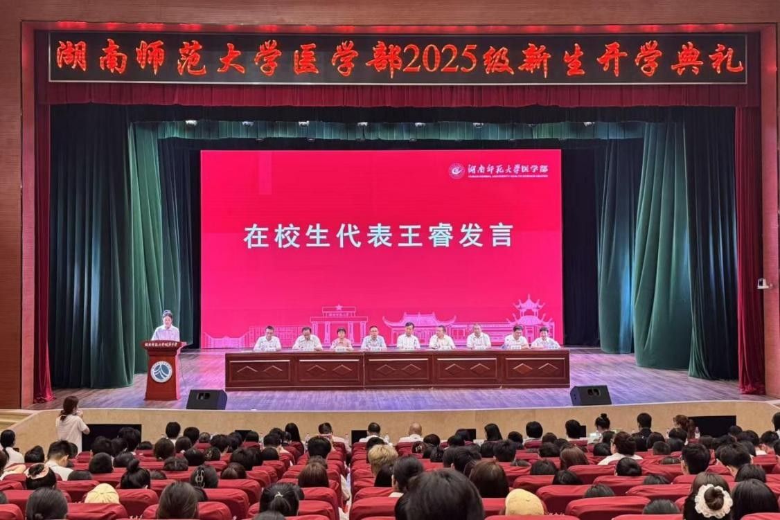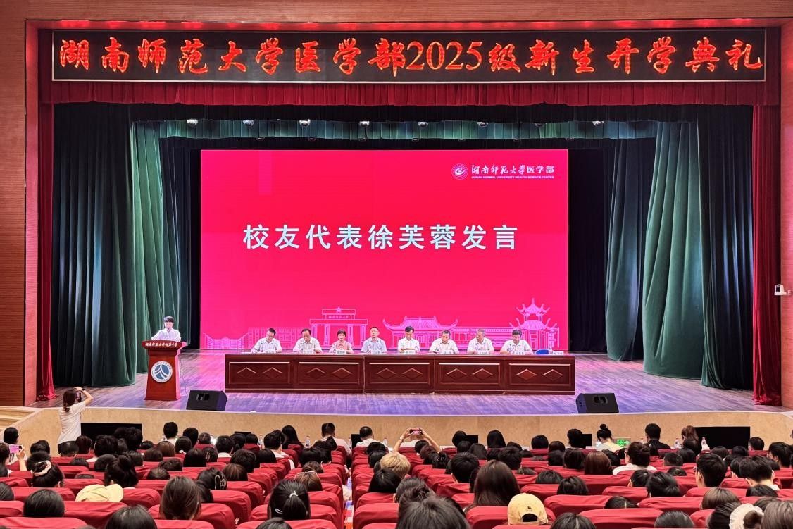 云天收夏色,木叶动秋声。9月15日上午,医学部2025级新生开学典礼在湖南师范大学附属中学孟其楼礼堂隆重举行。医学部党工委书记、主任祝益民,常德职业技术学院党委副书记、院长周华,岳阳职业技术学院党委委员、副院长付高勤,常德职业技术学院党委委员、副院长王朝晖,医学部党工委副书记鄢朝晖,医学部医学人才与学科建设处处长孙岳兵,医学部医学科技处处长彭小宁,湖南省人民医院急诊三部ICU护士长、校友徐芙蓉等出席典礼,典礼由学生工作办公室主任郭铭伟主持。