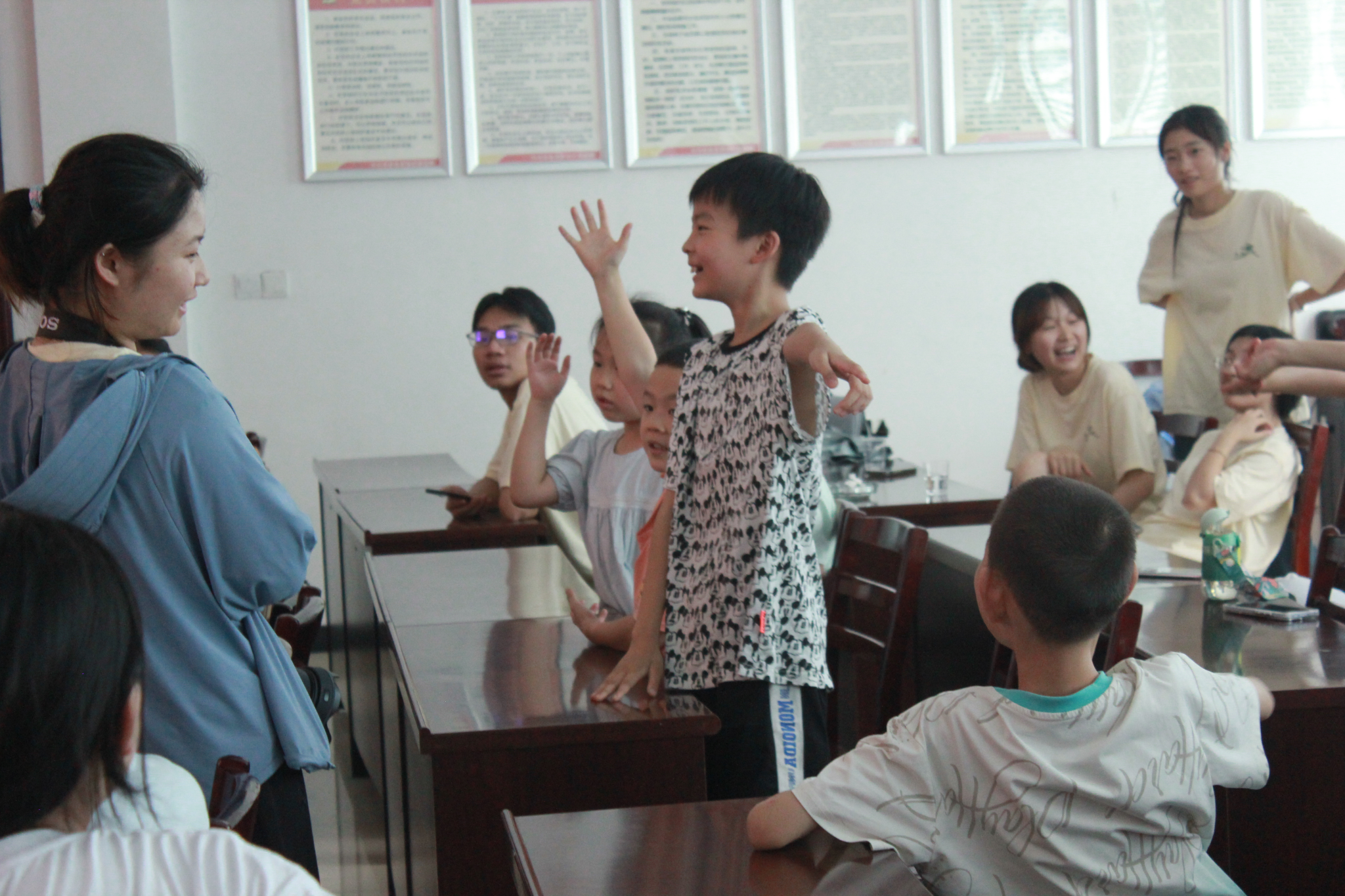 仪式结束后,实践团组织了一场破冰活动。团队成员依次进行简短的自我介绍,然后通过数字炸弹、击鼓传花、逛三园、萝卜蹲等简单有趣的小游戏,不仅让现场的气氛变得更加轻松愉悦,还促进了团队成员与孩子们之间的相互了解。