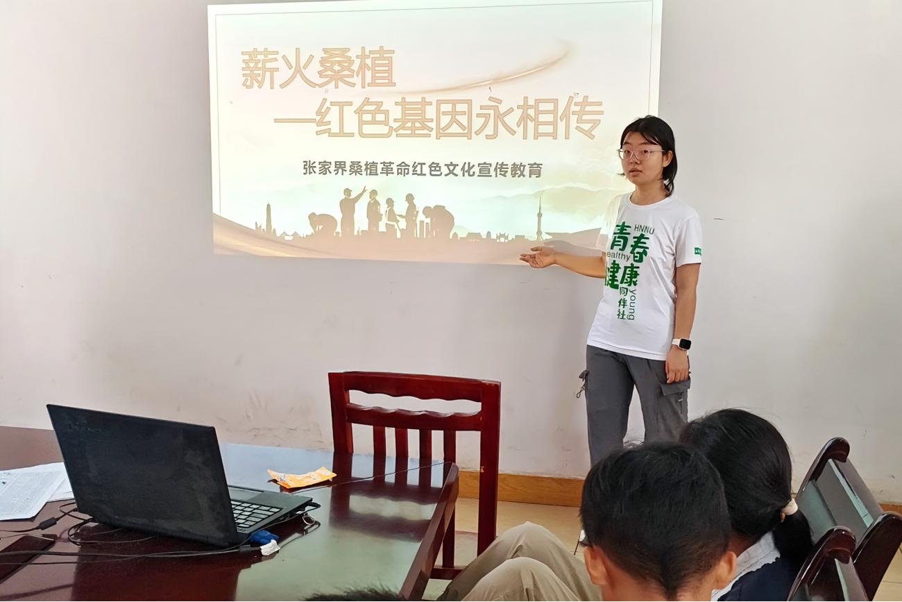 为了助力弘扬长征精神,追寻贺龙元帅革命印记,7月14日上午,医学部“乡伴童心,乡伴童行“暑期社会实践团在张家界市桑植县空壳树乡虎形村开展以“薪火桑植——红色基因永相传”为主题的红色论坛活动。虎形村部分学生和实践团全体成员参与此次活动。实践团成员任曼瑜、张欣祎担任主讲人。