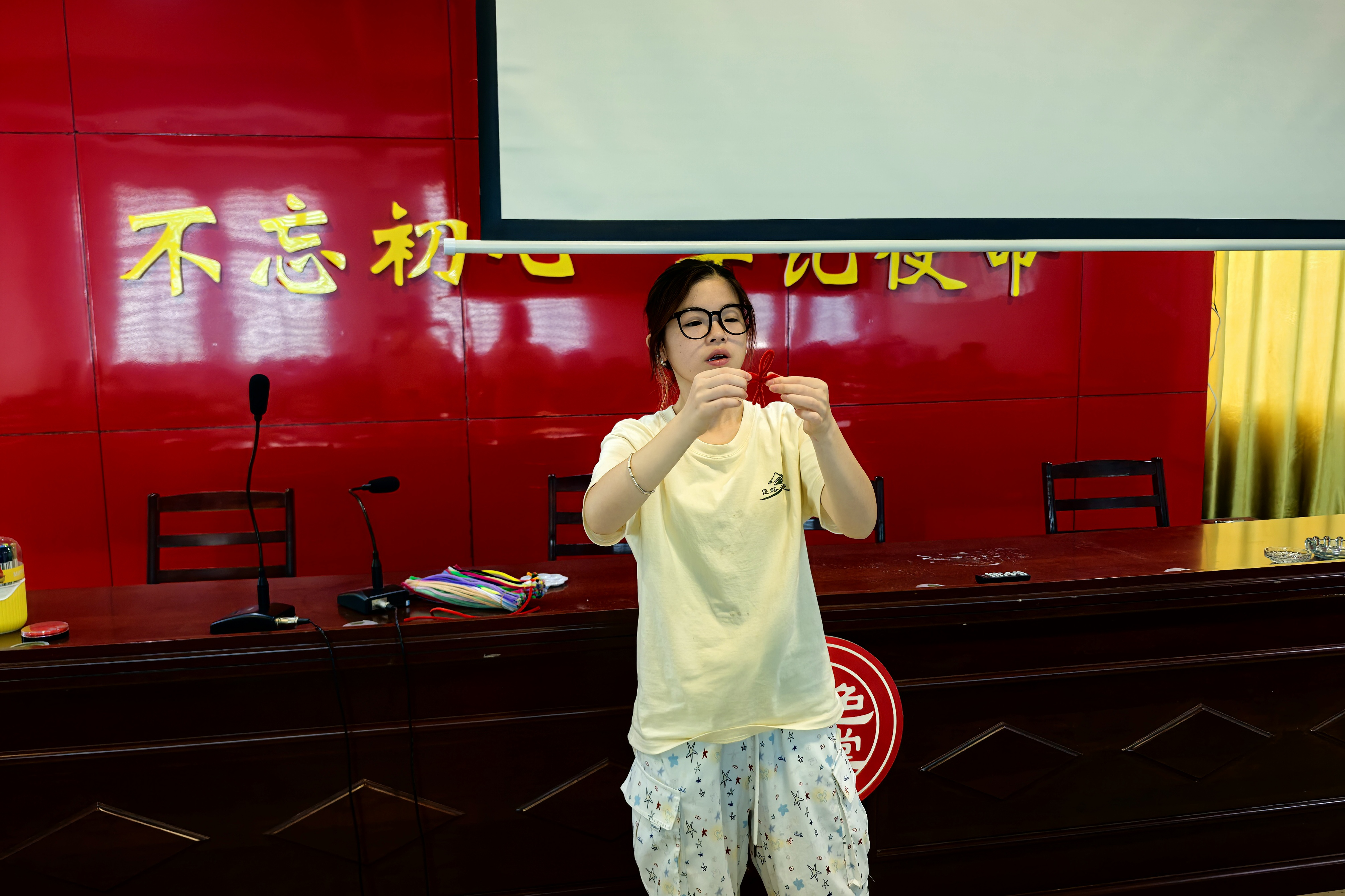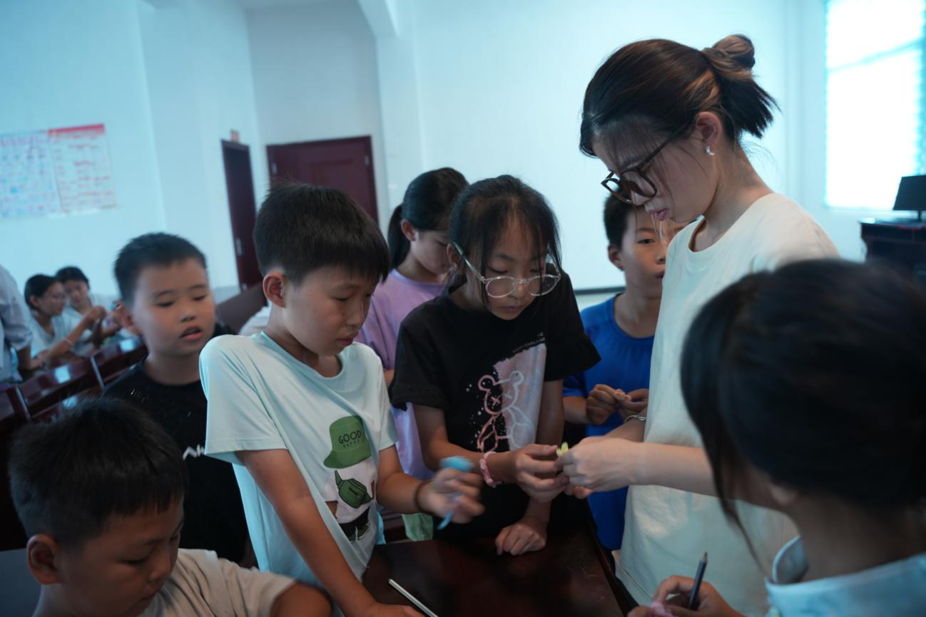 此次课程由实践团队长贾皙雅担任主讲人。教学活动主要分为示范讲解、动手实践和成果交流三个环节。活动伊始,团队成员向儿童分发了不同颜色的扭扭棒材料。在贾皙雅的讲解和分步演示下,孩子们学习并编织了具有传统文化特色的中国结。尽管中国结的制作步骤复杂,但在实践团成员的引导与协助下,大多数的孩子均独立完成了具有个人特色的中国结作品。另外的孩子通过同伴们的帮助下也完成了制作。部分儿童在完成中国结后,还向团队成员请教了玫瑰花等更复杂造型的制作方法。活动尾声,孩子们展示了自己的扭扭棒作品,并将其作为实践纪念带回家中。