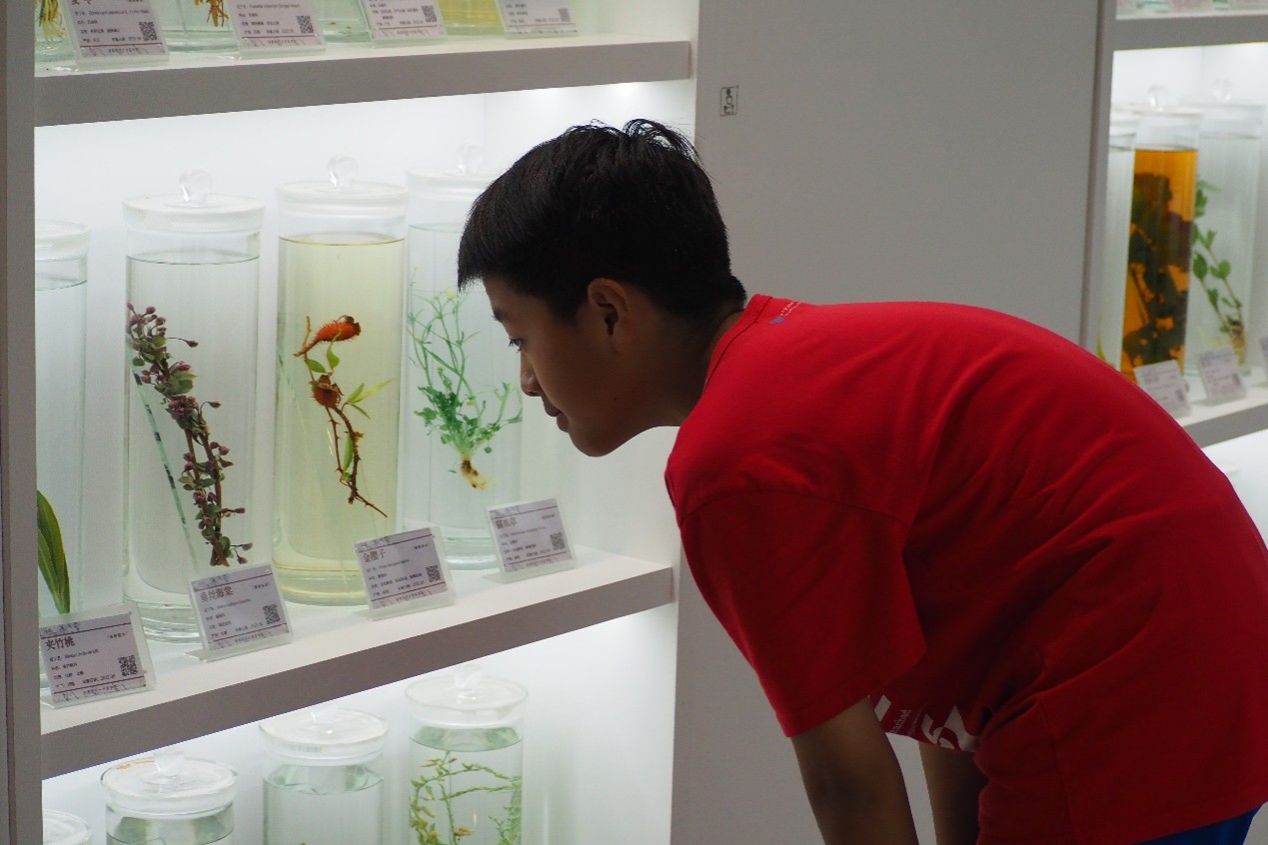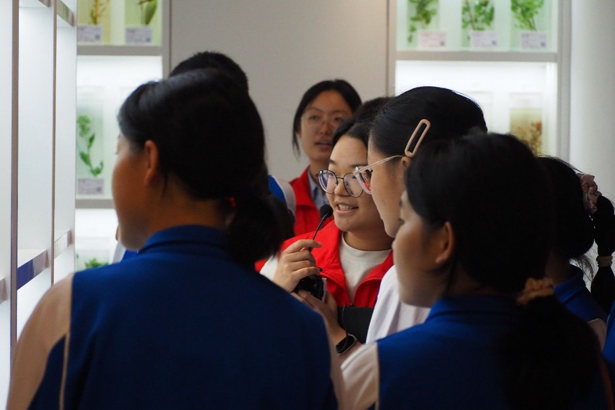 中草药标本展区内,千余种标本构筑起立体鲜活的本草世界。玻璃罐中浸泡的全草药材形态完整,压制精美的植物蜡叶标本脉络清晰,封装整齐的粉末药材样本色泽分明。讲解员细致地解读着枸杞 “滋补肝肾”、菊花 “清热解毒” 的药用价值,同学们或俯身凝视、或轻声探讨,指尖轻触展柜玻璃,将课本上的抽象文字转化为真切可感的认知。医学部的老师们始终伴随左右,耐心为学子们的每一个疑问答疑解惑,让探索之路更加顺畅。